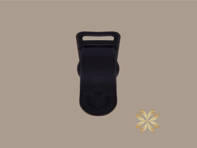 Fecho frontal 20mm com acabamento em hot stamping prata ou dourado.