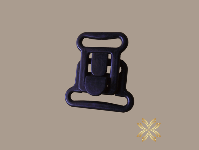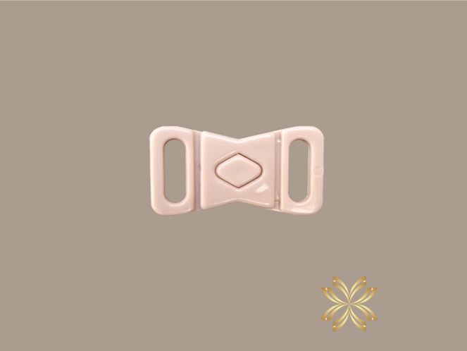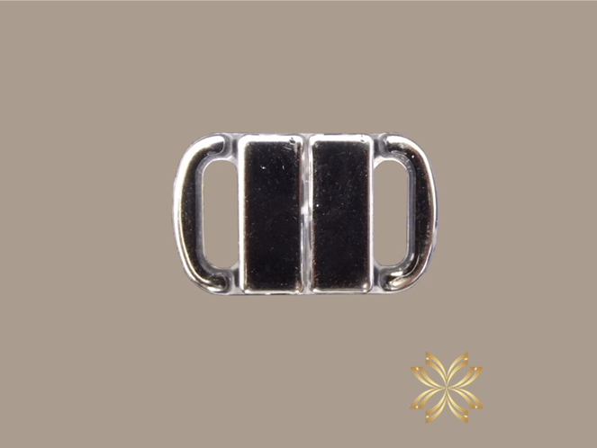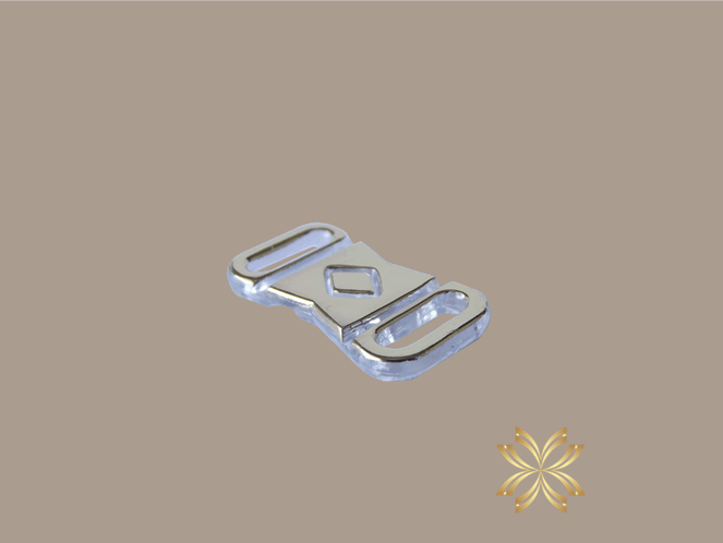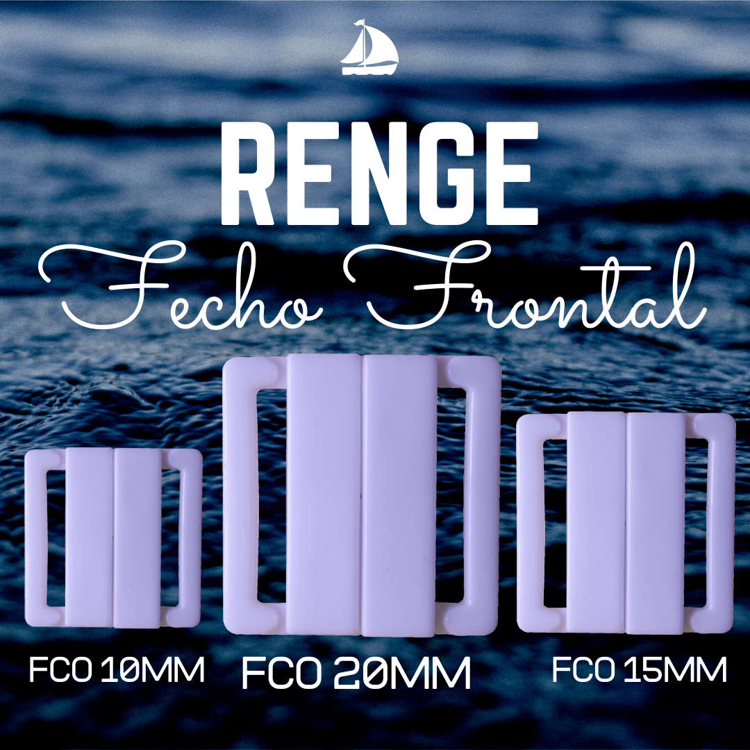 Fecho frontal 20mm com acabamento em hot stamping prata ou dourado.
